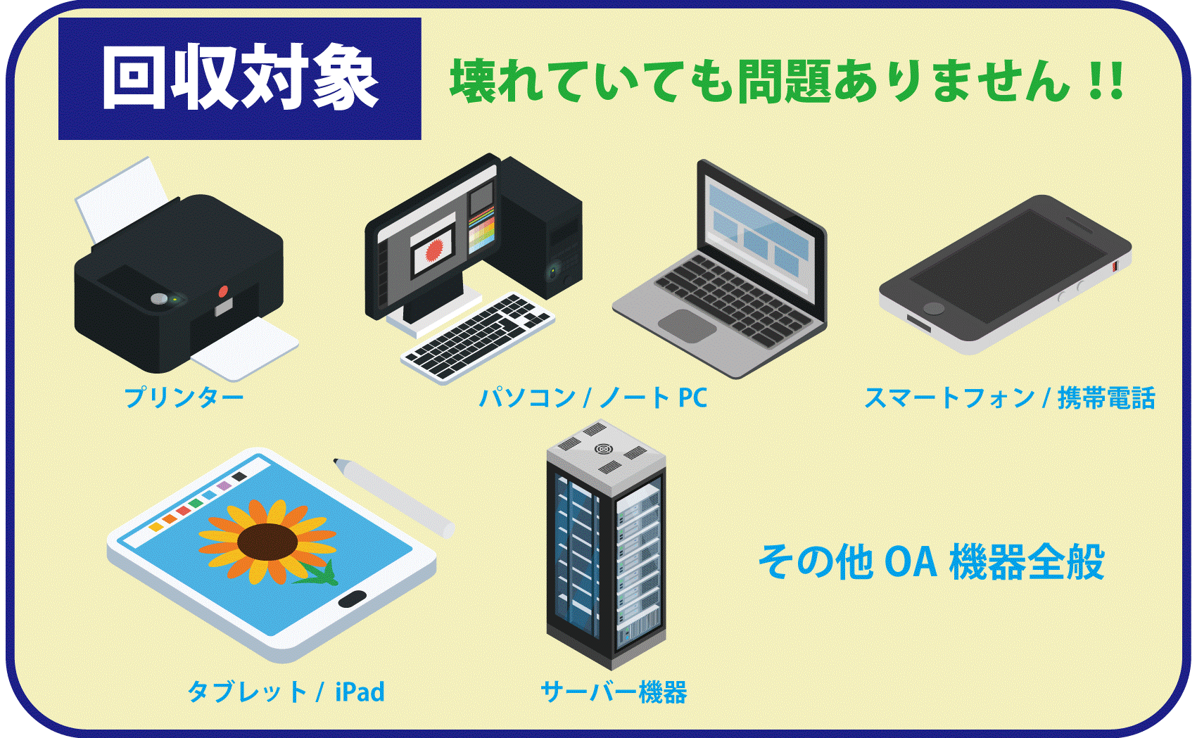 メーカー・種類を問わず、複数機器をまとめて回収可能です。 廃棄の手間とコスト削減にもつながります。