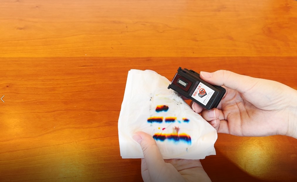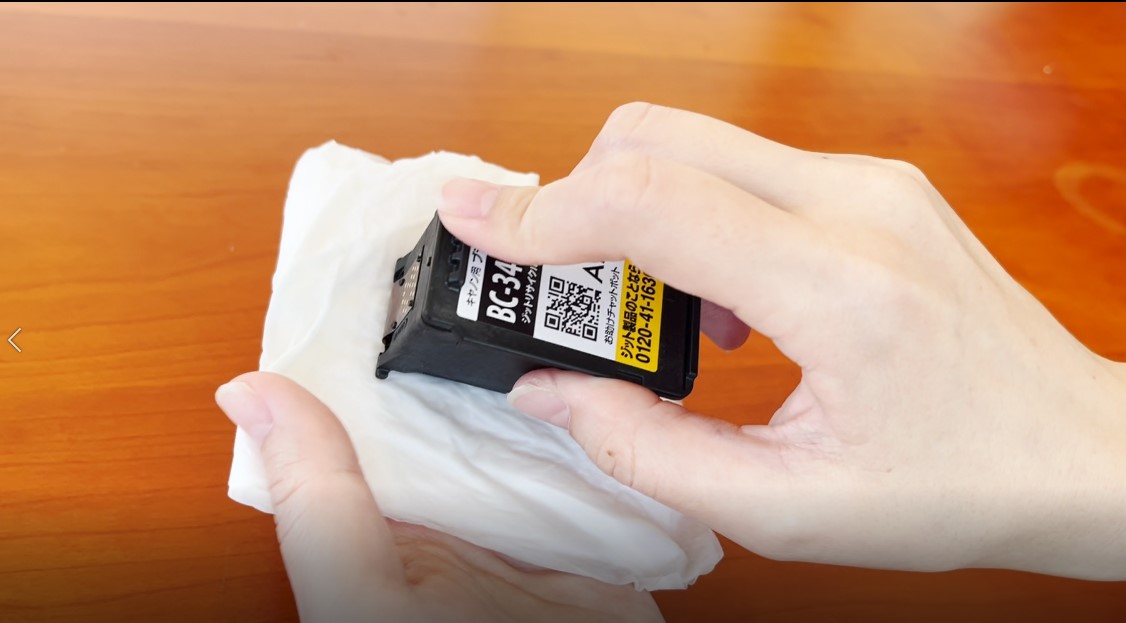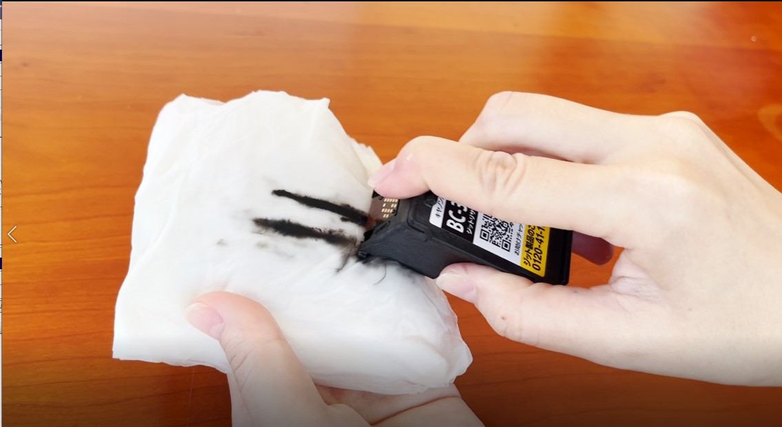 ③インクカートリッジの吐出口を②で用意した濡れティッシュに押し当ててください。